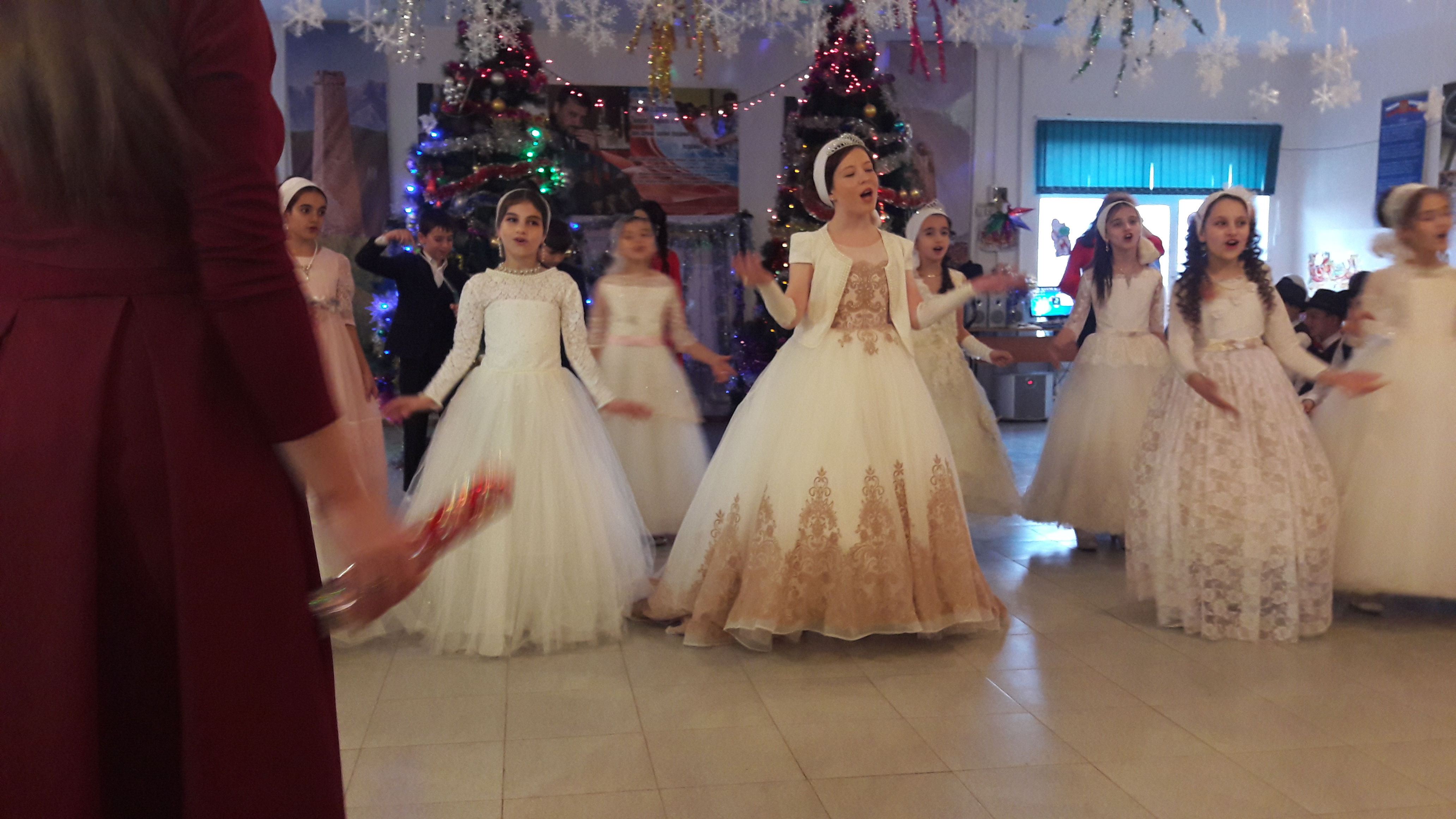 Новогодние представление прошли согласно графику. Кого только не было здесь и принц, и король, и шут, и скоморох, и джигиты, и горянки, и джентльмены, и утята, и все снежки мира казалось собрались тут у нашей елки, а также главные виновники торжества Дед Мороз и Снегурочка. В веселой новогодней атмосфере, дети читали стихи, пели песни, танцевали и водили хороводы. Номера выступлений менялись от классических танцев разных народностей (испанский, аварский, чеченский) до зажигательной лезгинки, от стихов про Новый год до различных постановок. Много сил и стараний в помочь проведений праздников приложили и родители. Победители в конкурсах на лучшее оформления классных помещений, рисунков «Зимушка-Зима» получили грамоты.